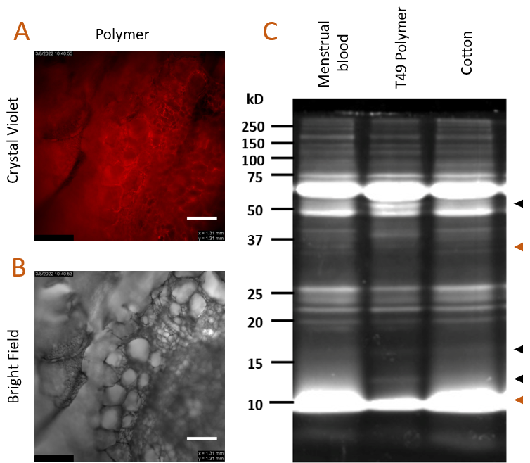Synthesis of polymer for target protein enrichment. (a) fluorescent signal of the material captured after being soaked at crystal violet overnight and underwent freeze drying. Scale bar = 200 microliter. (b) Bright field of the material captured. Scale bar = 200 microliter. (c) SDS PAGE analysis on the protein profile after cotton and our polymer being soaked in the human menstrual blood. The difference of protein profile was indicated by the arrows on the right hand side of the gel image. Black arrows indicate wanted protein enriched by the polymer while orange arrows indicate the reduction of unwanted protein by the polymer when compared to cotton.